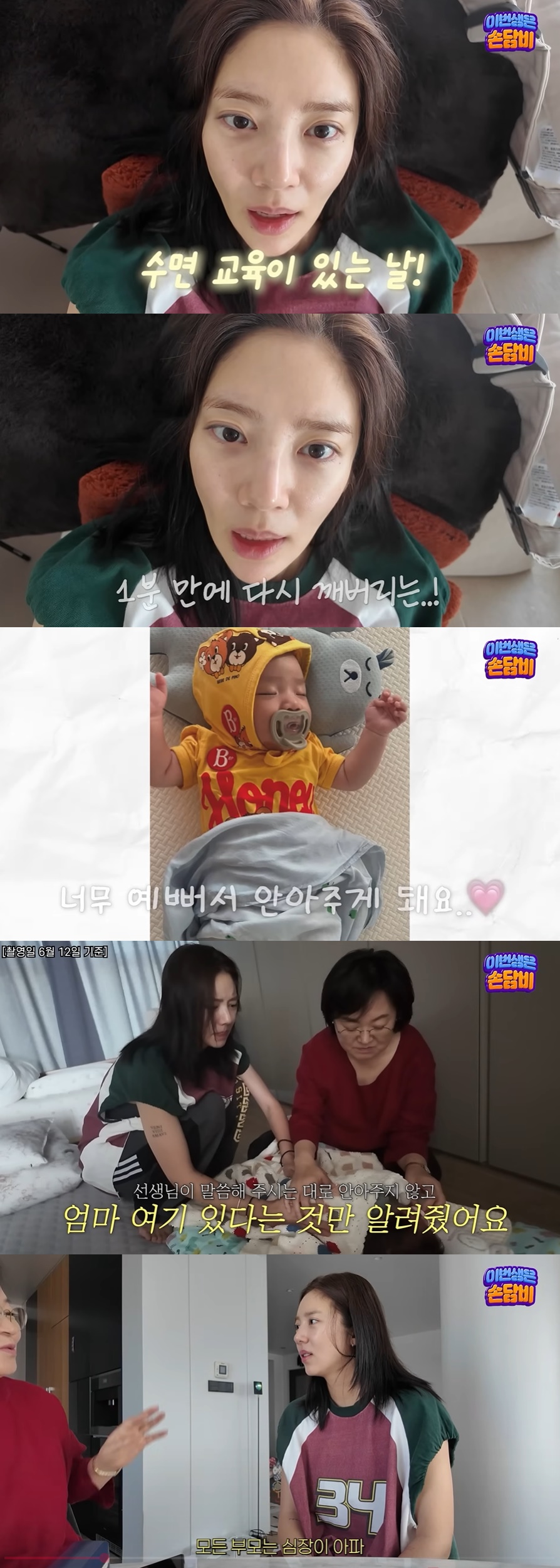 이어 손담비는 수면 교육 선생님과 함께 딸 해이의 수면 교육을 시작했다. 선생님은 "사람 품이 따뜻했잖아요. 그렇다고 되게 깊게 자는 게 아니다. 여기는 차갑다"라며 이부자리를 가리켰다.