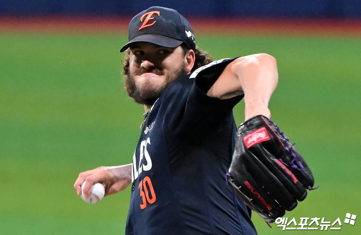(엑스포츠뉴스 고척, 김한준 기자) 4일 오후 서울 구로구 고척스카이돔에서 열린 '2025 신한 SOL Bank KBO리그' 한화 이글스와 키움 히어로즈의 경기, 1회말 한화 선발투수 폰세가 공을 힘차게 던지고 있다.