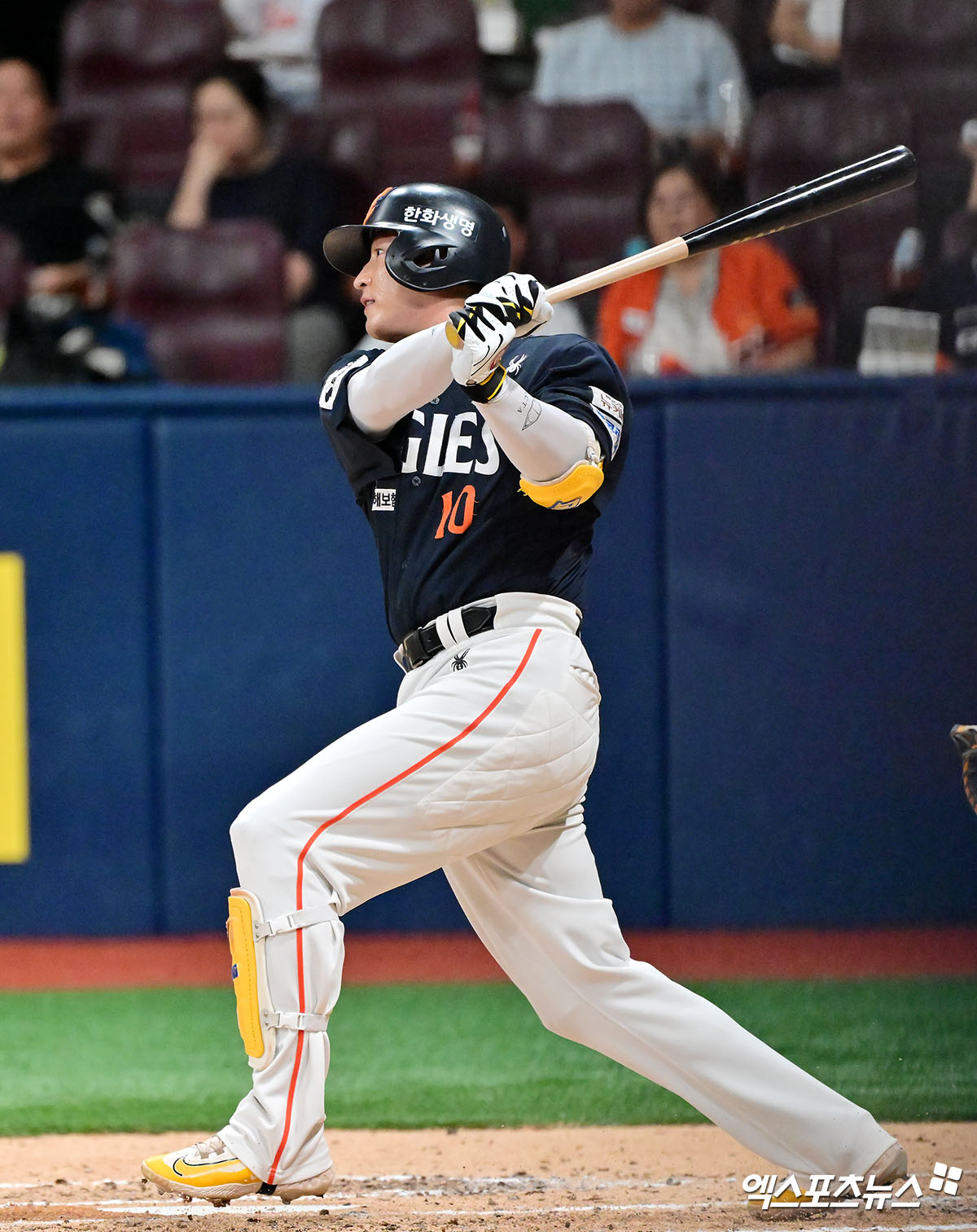 (엑스포츠뉴스 고척, 김한준 기자) 4일 오후 서울 구로구 고척스카이돔에서 열린 '2025 신한 SOL Bank KBO리그' 한화 이글스와 키움 히어로즈의 경기, 4회초 2사 1루 한화 이진영이 2루타를 날리고 있다.