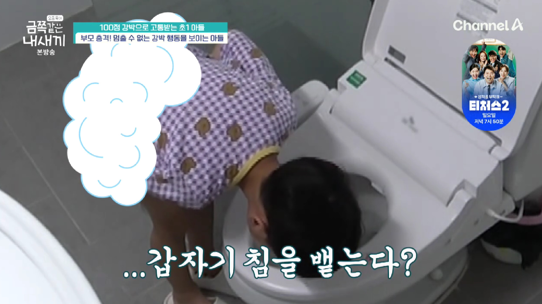 금쪽이의 강박은 숫자에서 멈추지 않았다. 깨끗한 변기를 한참이나 다시 닦았고, 볼일을 본 후 침을 뱉었다. 금쪽이 엄마는 "침을 뱉는 행동도 요근래 나왔다. 밖에서도 침을 뱉는다"라고 이야기했다.