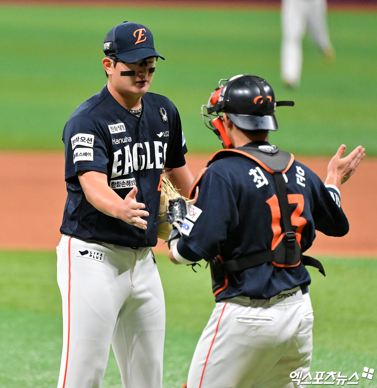 이날 경기에서 승리한 한화 김서현과 최재훈이 기뻐하고 있다.