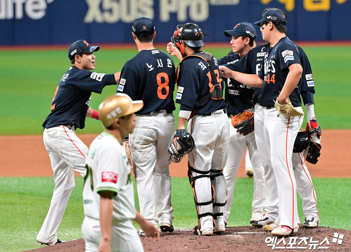 이날 경기에서 승리한 한화 선수들이 기뻐하고 있다.