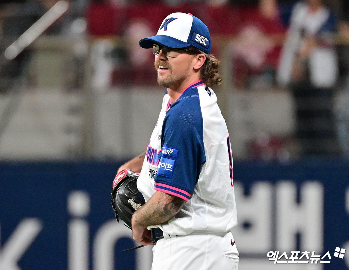 (엑스포츠뉴스 고척, 김한준 기자) 5일 오후 서울 구로구 고척스카이돔에서 열린 '2025 신한 SOL Bank KBO리그' 한화 이글스와 키움 히어로즈의 경기, 3회초 1사 키움 선발투수 웰스가 스톤의 수비에 감탄하고 있다.