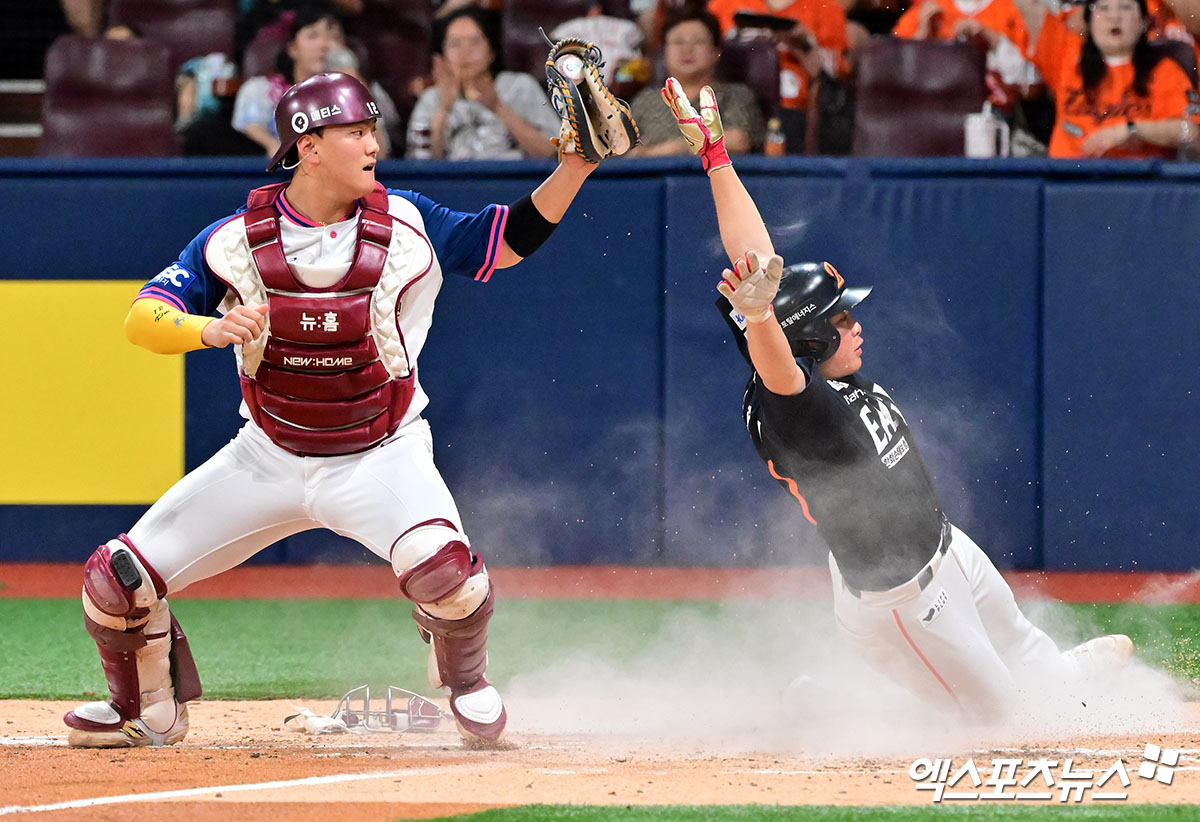 (엑스포츠뉴스 고척, 김한준 기자) 5일 오후 서울 구로구 고척스카이돔에서 열린 '2025 신한 SOL Bank KBO리그' 한화 이글스와 키움 히어로즈의 경기, 4회초 1사 1,3루 한화 문현빈이 이진영의 내야땅볼때 득점에 성공하고 있다.