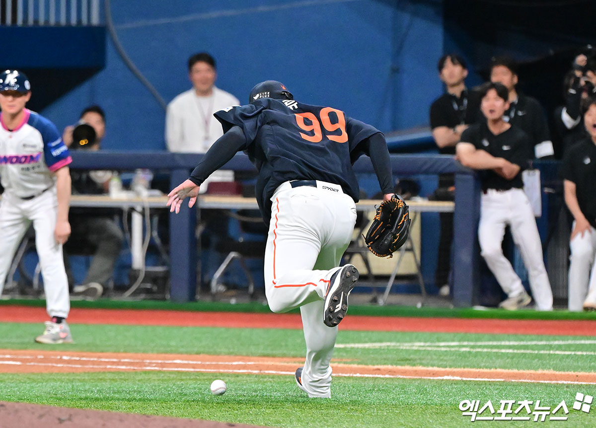(엑스포츠뉴스 고척, 김한준 기자) 5일 오후 서울 구로구 고척스카이돔에서 열린 '2025 신한 SOL Bank KBO리그' 한화 이글스와 키움 히어로즈의 경기, 5회말 2사 만루 한화 류현진이 키움 최주환의 내야땅볼을 처리하기 위해 타구를 쫓아가고 있다.