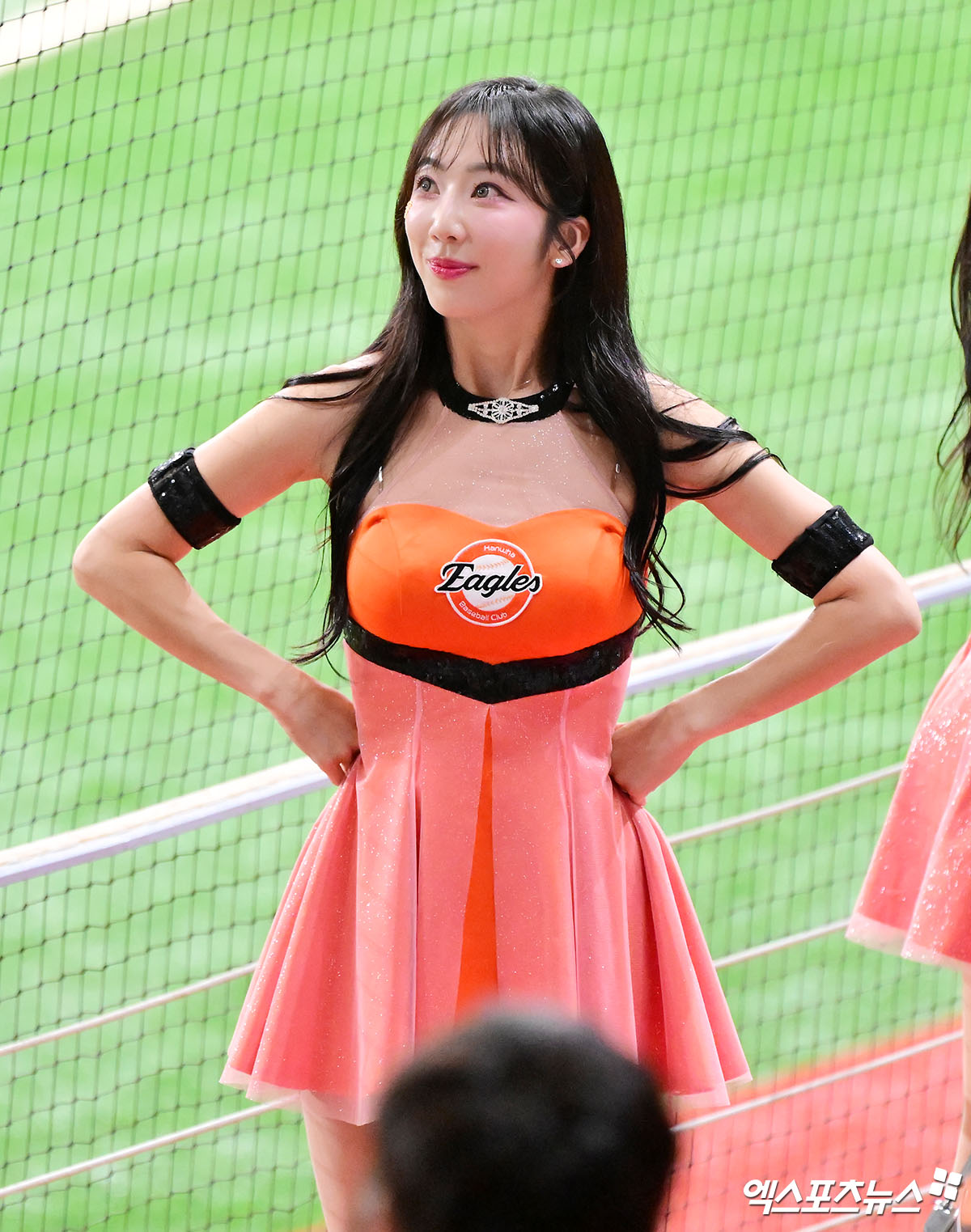 (엑스포츠뉴스 고척, 김한준 기자) 6일 오후 서울 구로구 고척스카이돔에서 열린 '2025 신한 SOL Bank KBO리그' 한화 이글스와 키움 히어로즈의 경기, 이미래 치어리더가 열띤 응원을 선보이고 있다.