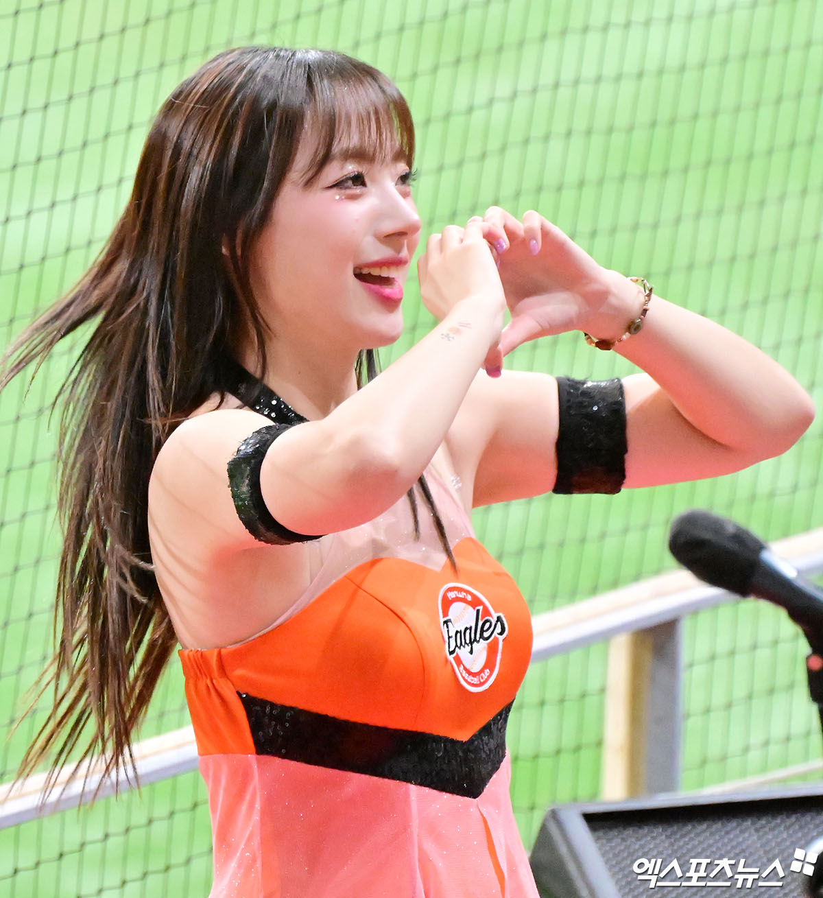 (엑스포츠뉴스 고척, 김한준 기자) 6일 오후 서울 구로구 고척스카이돔에서 열린 '2025 신한 SOL Bank KBO리그' 한화 이글스와 키움 히어로즈의 경기, 하지원 치어리더가 열띤 응원을 선보이고 있다.