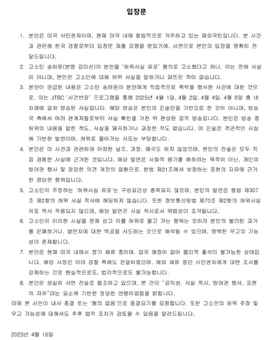 '수사에 협조하지 않아 지명통보 처분을 받았다'는 입장문 또한 "명백한 사실 왜곡"이라고 강조한 A씨는 " 2025년 7월 3일 경찰로부터 지명통보 처분을 받았음을 확인했으며, 경찰과의 실제 대화 내용과 수사 진행 현황을 확인한 결과, 저는 미국에 거주 중인 미국 시민권자로서 국내 수사기관에 출석 협조가 어려운 점을 경찰 측에 충분히 설명하였고, 이에 수사는 중지됐다"고 전했다.