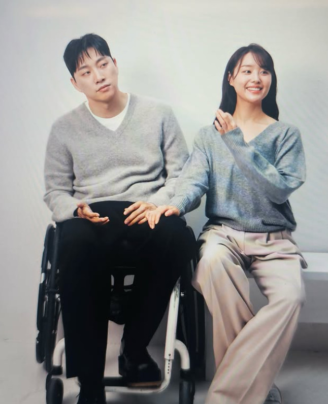공개된 사진 속 송지은은 휠체어에 앉아 있는 박위의 손을 다정히 맞잡은 채 환한 미소를 짓고 있으며, 박위 역시 편안한 표정으로 그녀를 바라보고 있다. 두 사람은 그레이 톤의 커플 니트를 착용한 모습이다.