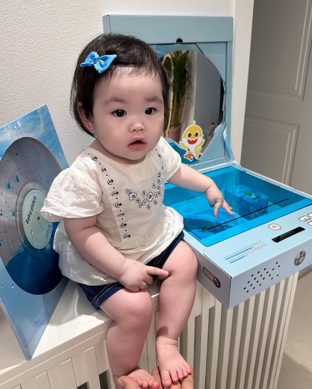 공개된 사진에는 파란색 리본 머리핀을 하고 있는 재이의 모습이 담겨 있으며, 재이가 앉은 곳에 장식된 '아기상어' 캐릭터가 그려진 파란색 물건들이 눈길을 끈다.