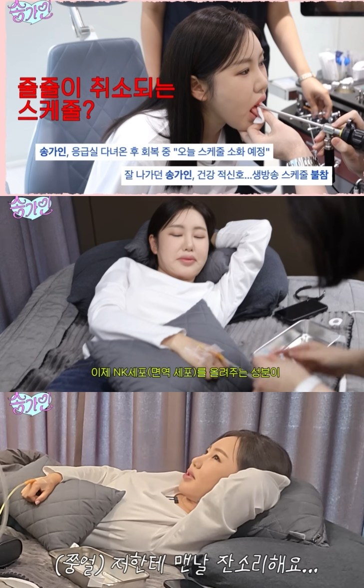 수액을 맞으며 송가인은 "내가 소화 안 돼서 체했을 때, 실장님이 약국 뛰어가서 자기 돈으로 약을 사왔다. 내가 몇 번 살았다"며 감사함을 표했다.