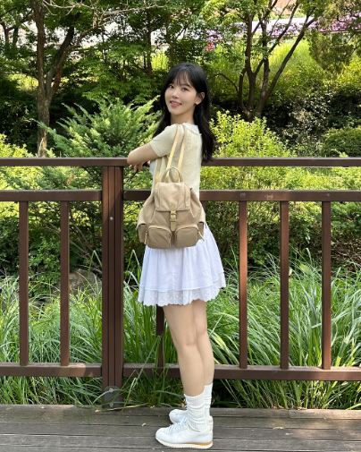 여기에 허리 스트링으로 실루엣을 잡아준 레이스 디테일의 미니 스커트가 러블리한 매력을 더했고, 아이보리 톤의 미디움 사이즈 백팩과 양말, 스니커즈까지 통일감 있게 스타일링해 깔끔하면서도 편안한 데일리룩을 완성했다.