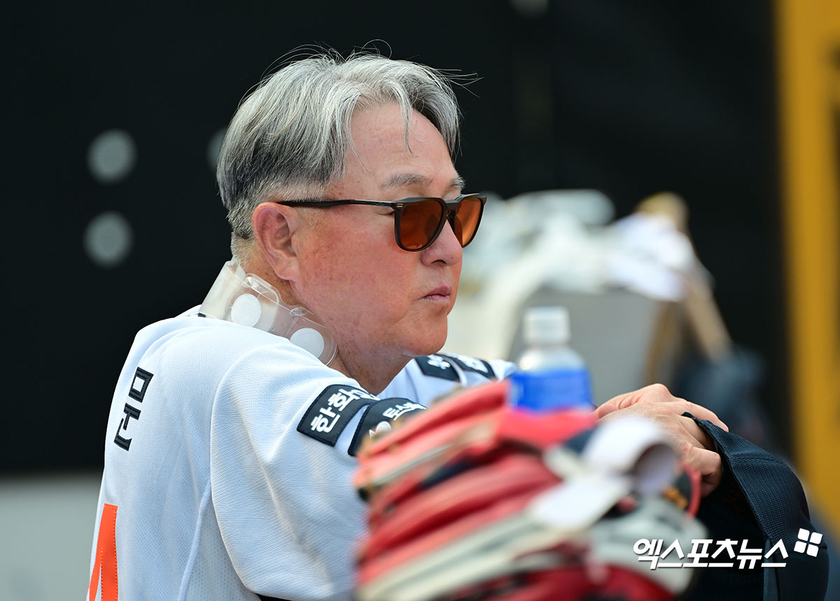 (엑스포츠뉴스 대전, 김한준 기자) 8일 오후 대전 한화생명 볼파크에서 열리는 '2025 신한 SOL Bank KBO리그' KIA 타이거즈와 한화 이글스의 경기, 한화 김경문 감독이 선수들의 훈련을 지켜보고 있다.