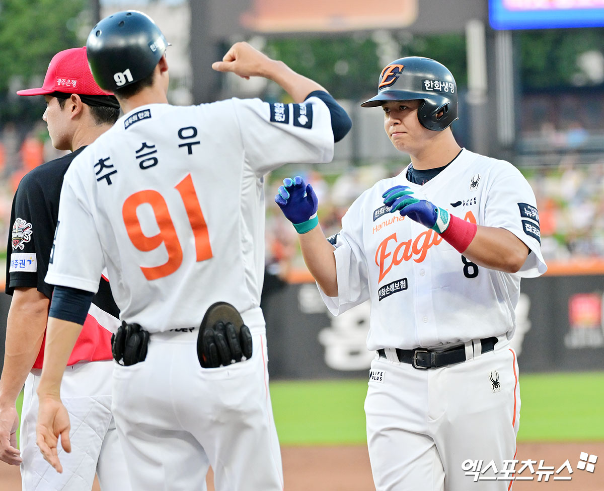 (엑스포츠뉴스 대전, 김한준 기자) 8일 오후 대전 한화생명 볼파크에서 열린 '2025 신한 SOL Bank KBO리그' KIA 타이거즈와 한화 이글스의 경기, 1회말 무사 2,3루 한화 노시환이 1타점 적시타를 날리고 있다.