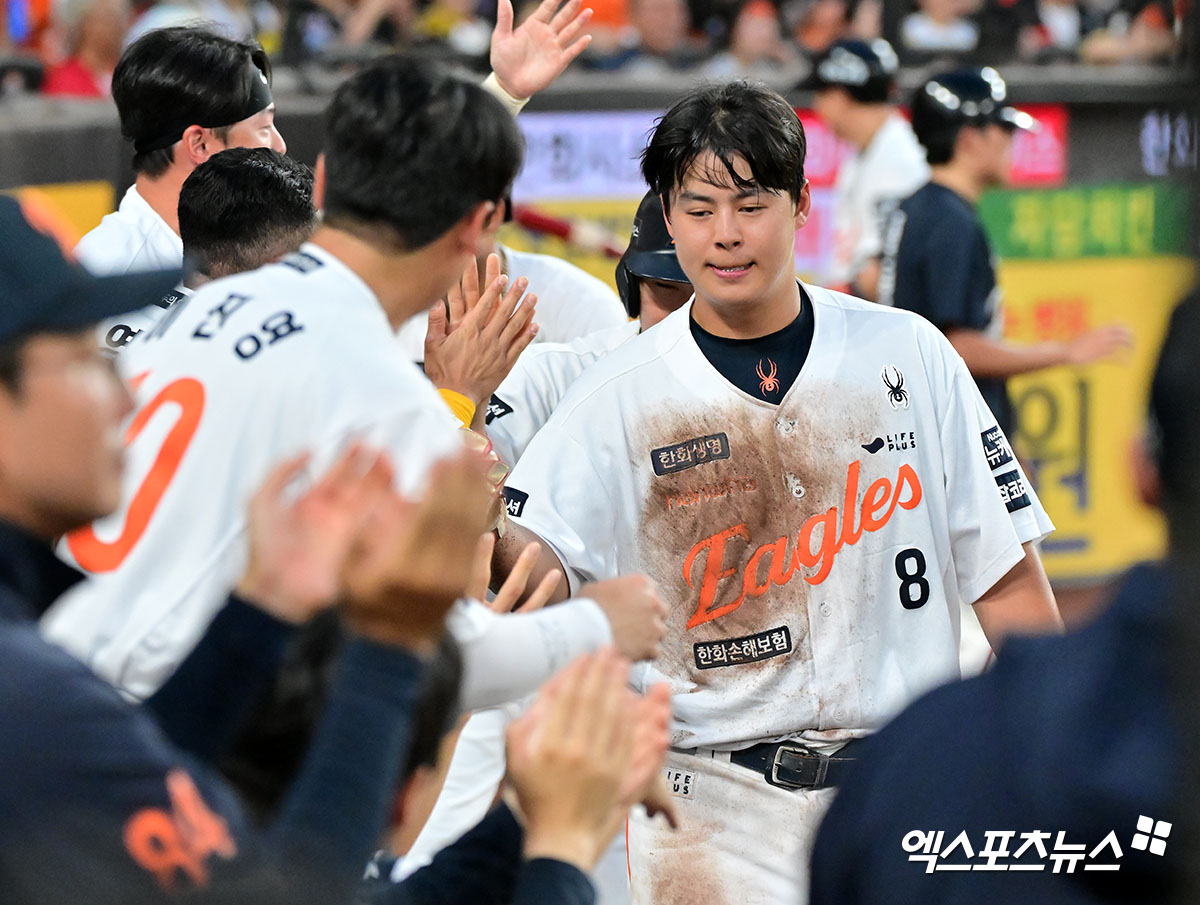 (엑스포츠뉴스 대전, 김한준 기자) 8일 오후 대전 한화생명 볼파크에서 열린 '2025 신한 SOL Bank KBO리그' KIA 타이거즈와 한화 이글스의 경기, 3회말 1사 3루 한화 노시환이 채은성의 3타점 2루타때 득점에 성공하고 있다.
