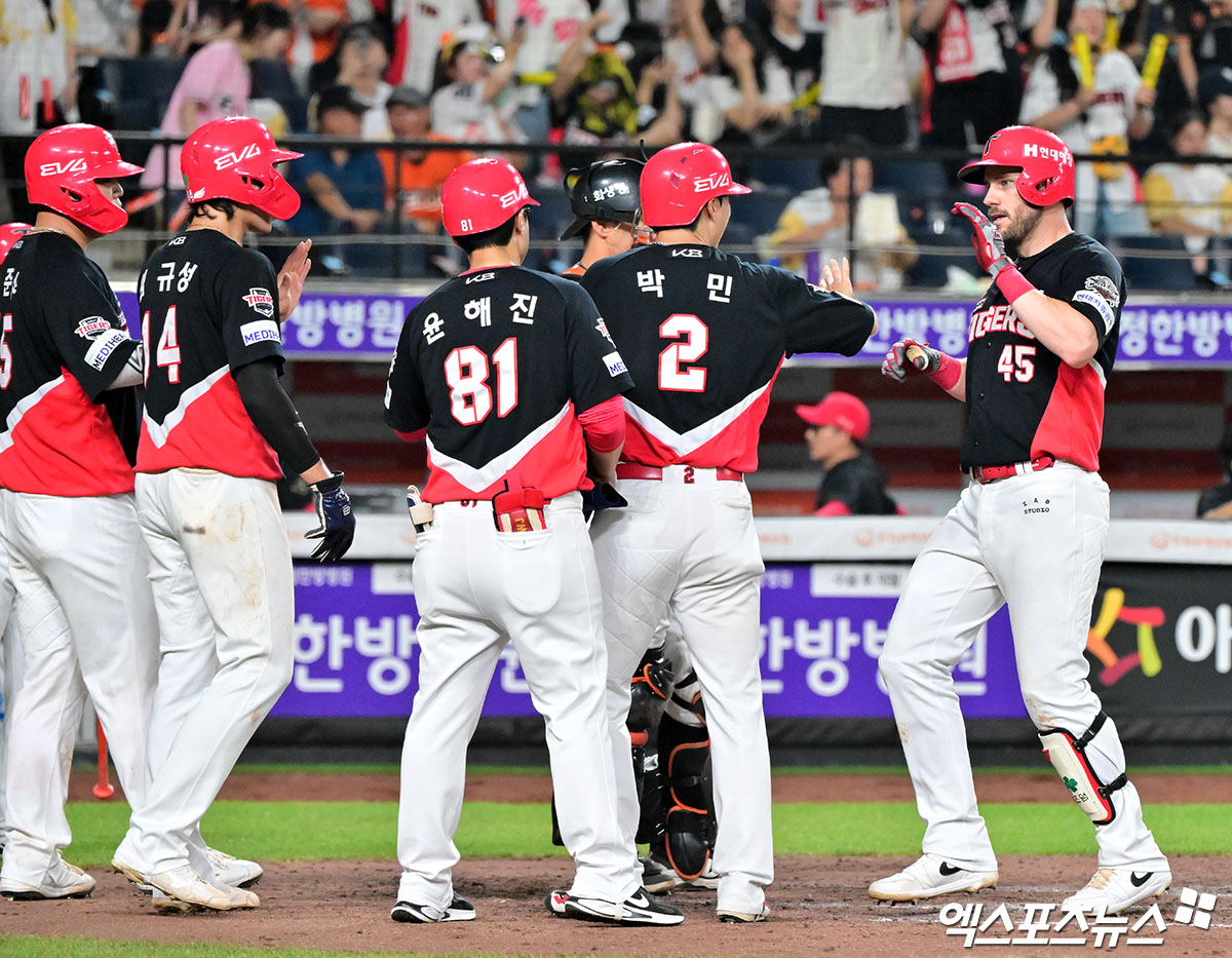 (엑스포츠뉴스 대전, 김한준 기자) 8일 오후 대전 한화생명 볼파크에서 열린 '2025 신한 SOL Bank KBO리그' KIA 타이거즈와 한화 이글스의 경기, 8회초 1사 만루 KIA 위즈덤이 만루 홈런을 날리고 있다.