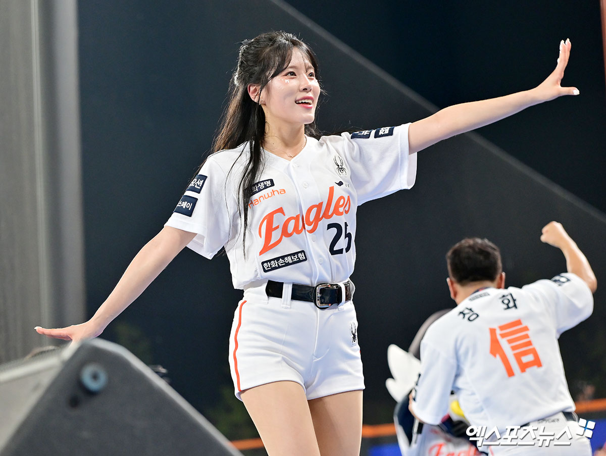 (엑스포츠뉴스 대전, 김한준 기자) 8일 오후 대전 한화생명 볼파크에서 열린 '2025 신한 SOL Bank KBO리그' KIA 타이거즈와 한화 이글스의 경기, 유진경 치어리더가 열띤 응원을 선보이고 있다.