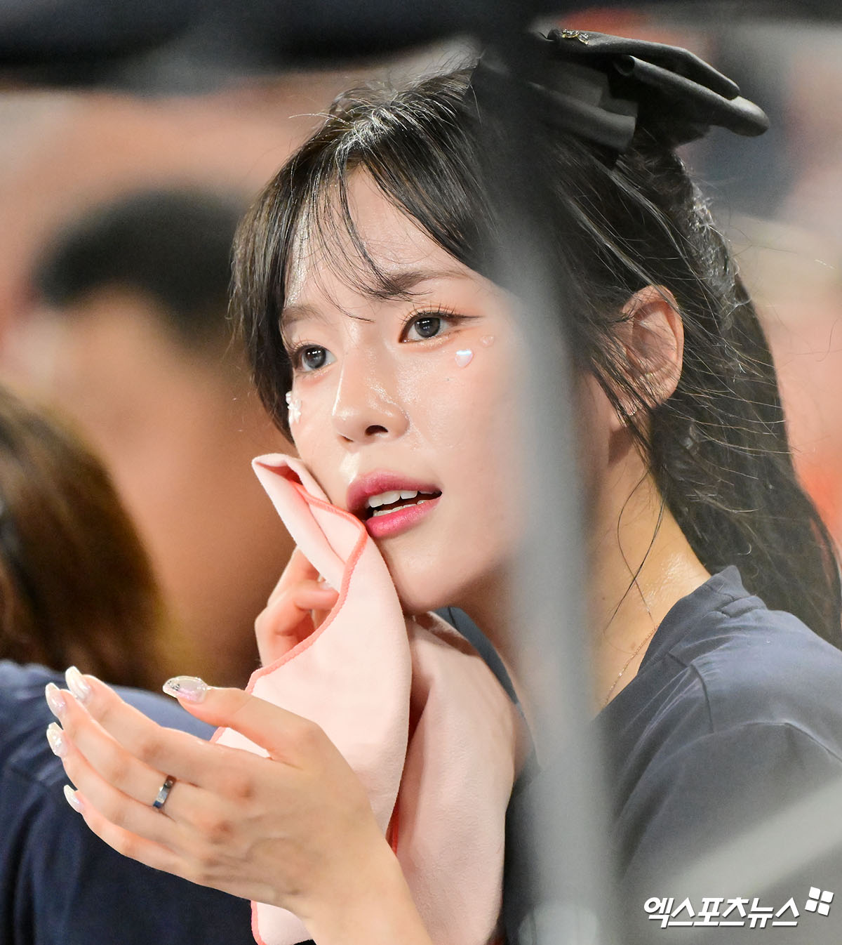 (엑스포츠뉴스 대전, 김한준 기자) 8일 오후 대전 한화생명 볼파크에서 열린 '2025 신한 SOL Bank KBO리그' KIA 타이거즈와 한화 이글스의 경기, 치어리더 유진경이 땀을 닦고 있다.