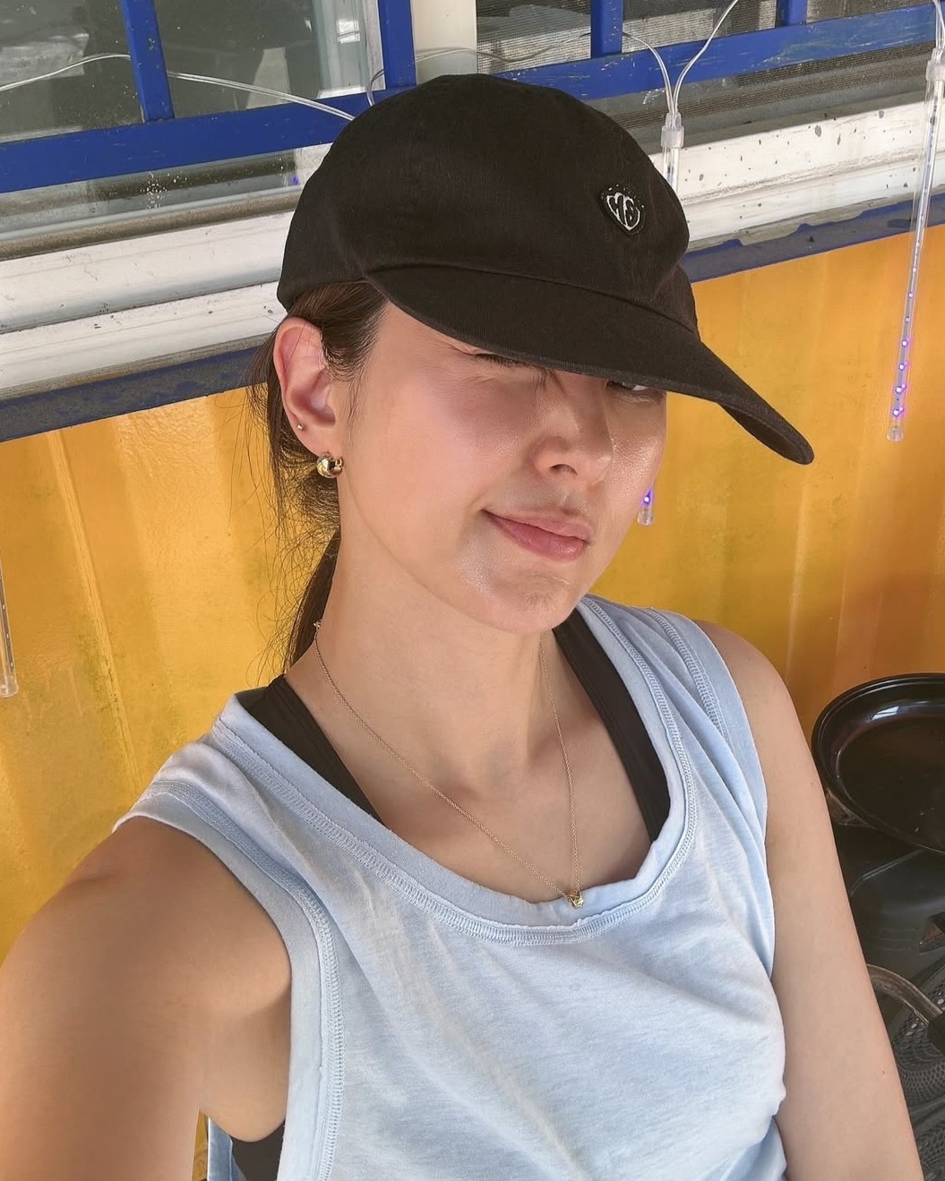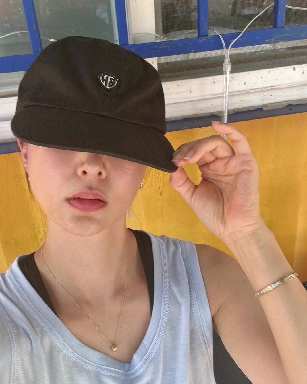 공개된 사진 속 한채아는 검은색 볼캡을 착용하고 있으며, 검은색 슬리브리스 운동복 위에 회색 상의를 덧입은 편안한 옷차림으로 눈길을 끈다.