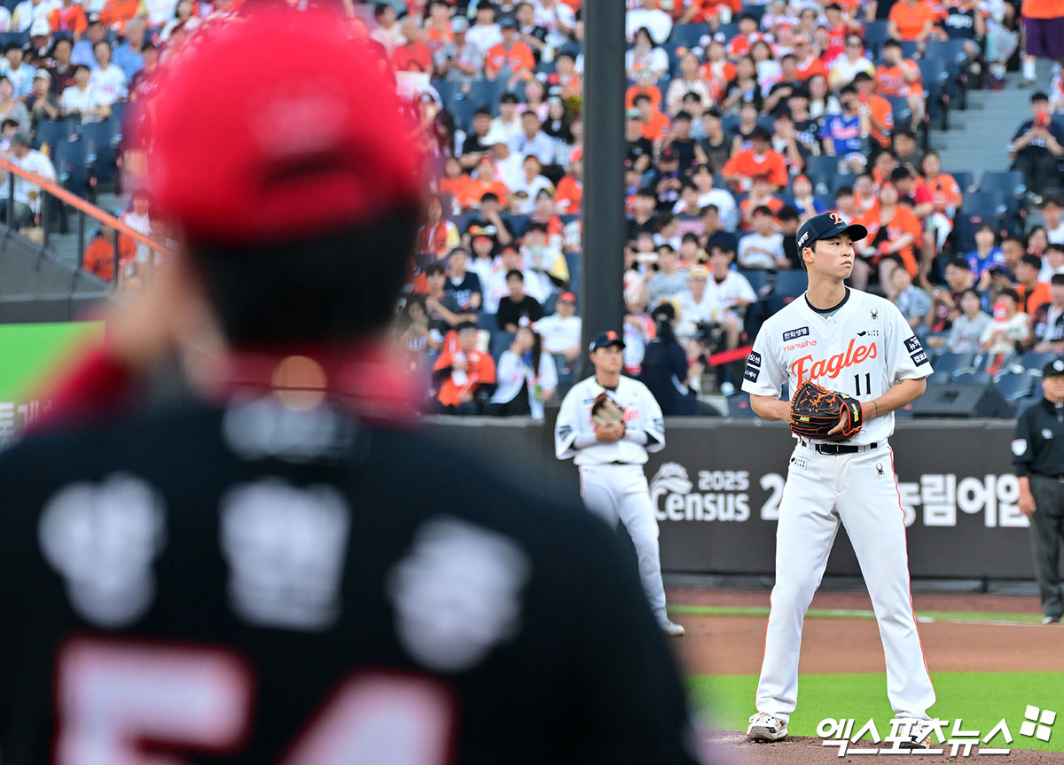 (엑스포츠뉴스 대전, 김한준 기자) 9일 오후 대전 한화생명 볼파크에서 열린 '2025 신한 SOL Bank KBO리그' KIA 타이거즈와 한화 이글스의 경기, 1회초 한화 선발투수 엄상백이 공을 힘차게 던지고 있다.