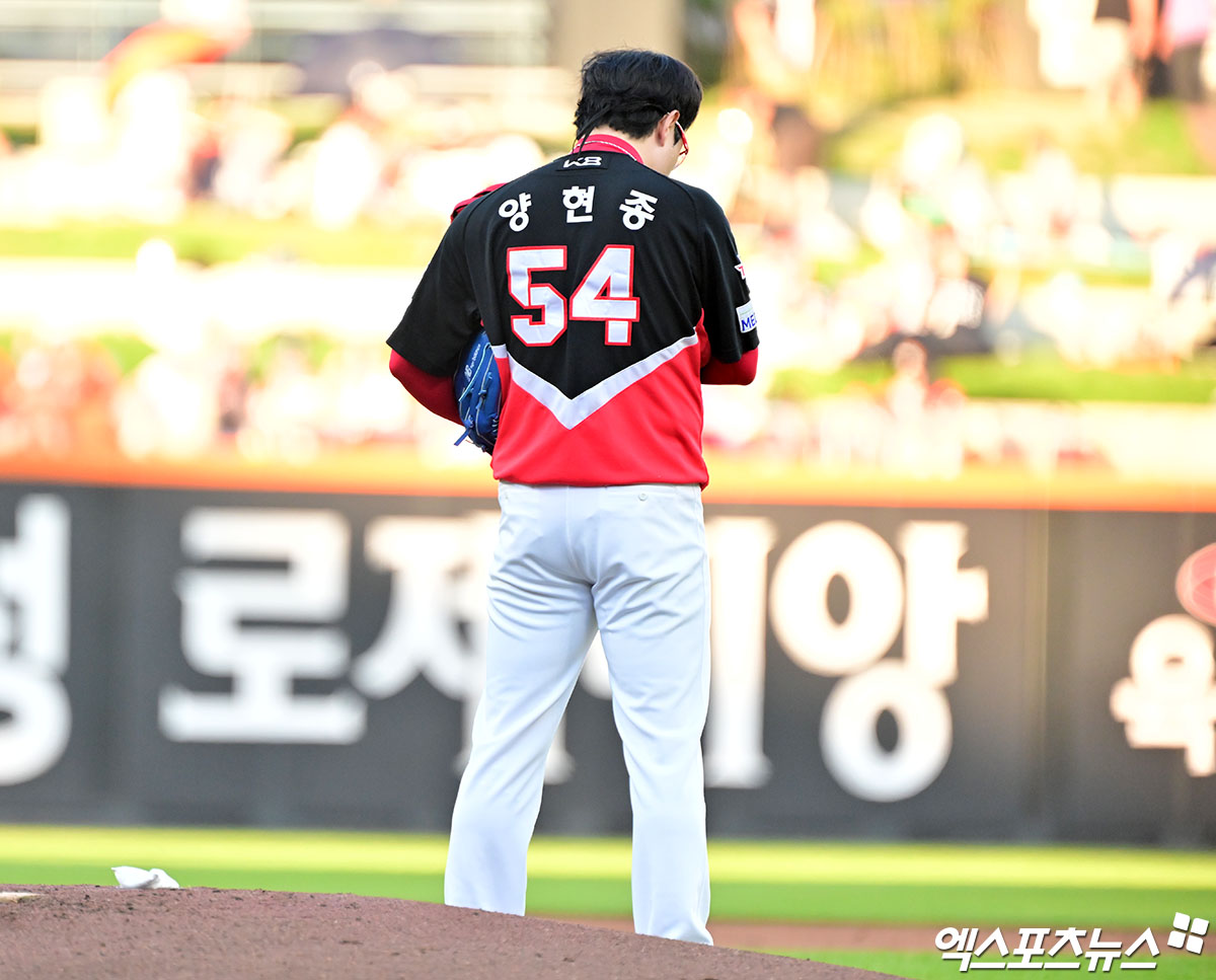(엑스포츠뉴스 대전, 김한준 기자) 9일 오후 대전 한화생명 볼파크에서 열린 '2025 신한 SOL Bank KBO리그' KIA 타이거즈와 한화 이글스의 경기, 1회말 KIA 선발투수 양현종이 투구 준비를 하고 있다.