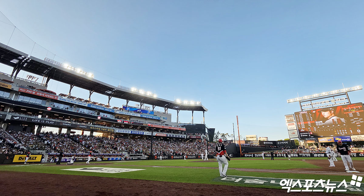 이날 대전지방기상청이 발표한 대전 지역 최고 기온은 36도. 경기 전 선수들의 훈련 시간에는 온도계가 39도를 가리킬 정도로 뜨거웠다. 경기 개시 후에도 계속되는 무더위, 하지만 팬들은 이 날씨 속에서도 '직관'을 선택, 볼파크의 자리를 가득 채웠다.