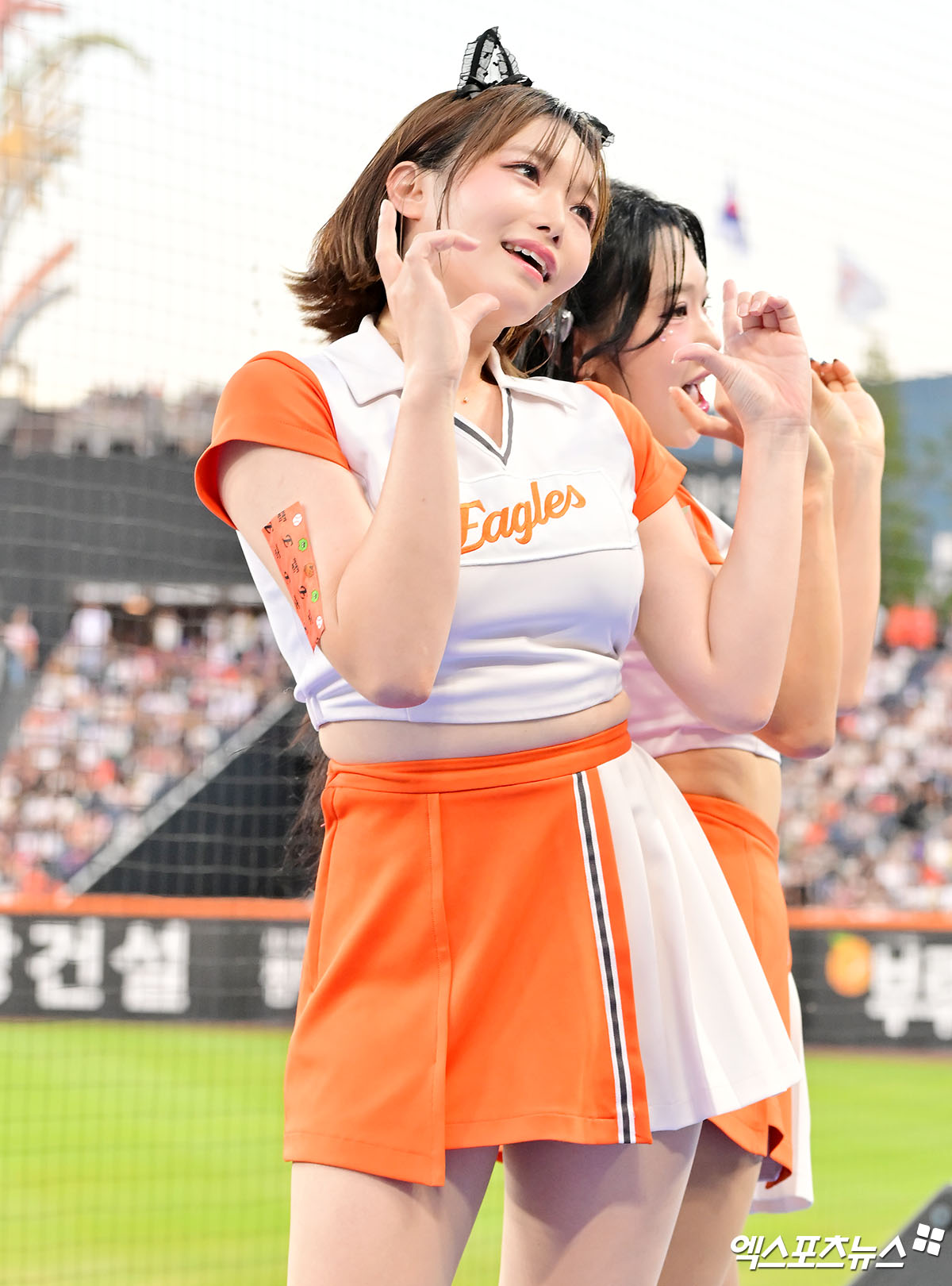 (엑스포츠뉴스 대전, 김한준 기자) 9일 오후 대전 한화생명 볼파크에서 열린 '2025 신한 SOL Bank KBO리그' KIA 타이거즈와 한화 이글스의 경기, 아야카 치어리더가 멋진 공연을 선보이고 있다.