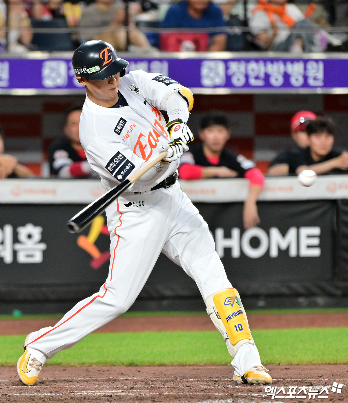 (엑스포츠뉴스 대전, 김한준 기자) 9일 오후 대전 한화생명 볼파크에서 열린 '2025 신한 SOL Bank KBO리그' KIA 타이거즈와 한화 이글스의 경기, 4회말 1사 만루 한화 이진영이 2타점 적시타를 날리고 있다.