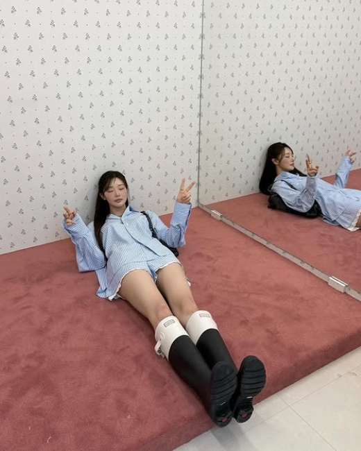 여기에 레인부츠의 시크한 무드와 짧은 쇼츠가 어우러져 그의 다리 라인을 강조하며 세련된 '꾸안꾸' 룩을 완성했다.
