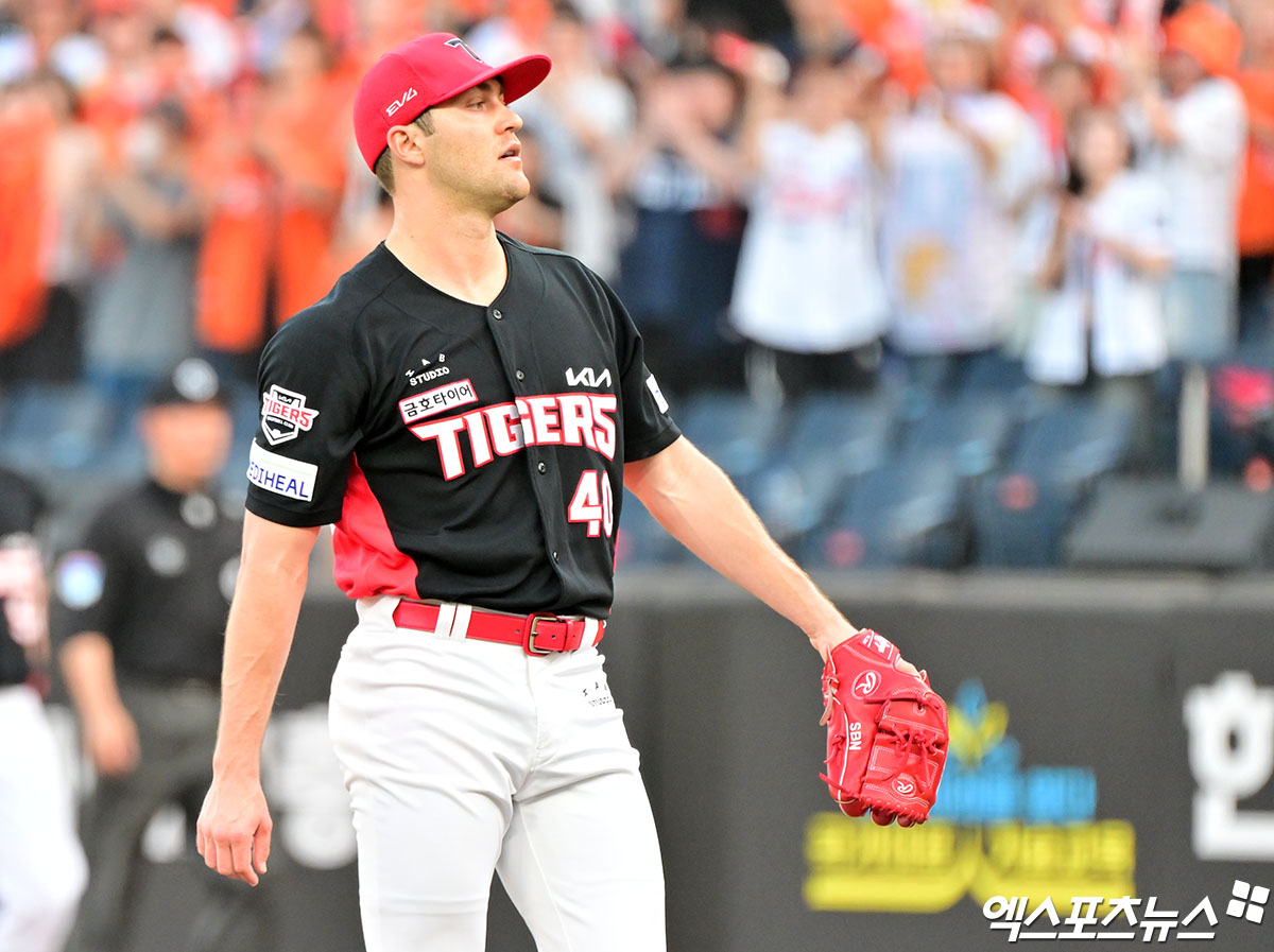 (엑스포츠뉴스 대전, 김한준 기자) 10일 오후 대전 한화생명 볼파크에서 열린 '2025 신한 SOL Bank KBO리그' KIA 타이거즈와 한화 이글스의 경기, 1회말 2사 KIA 네일이 11구 승부 끝에 볼넷을 허용하자 아쉬워하고 있다.