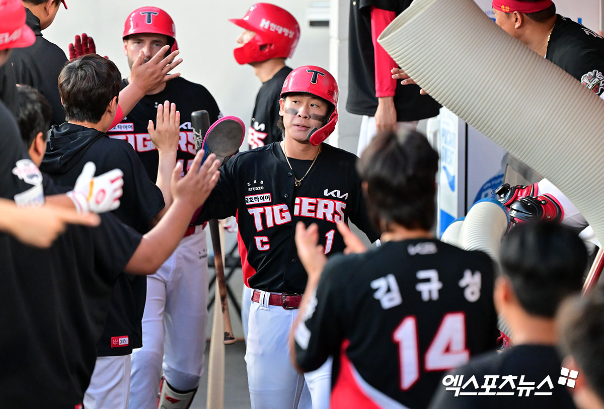 (엑스포츠뉴스 대전, 김한준 기자) 10일 오후 대전 한화생명 볼파크에서 열린 '2025 신한 SOL Bank KBO리그' KIA 타이거즈와 한화 이글스의 경기, 4회초 무사 1,3루 KIA 박찬호가 위즈덤의 1타점 희생플라이때 득점에 성공하고 있다.