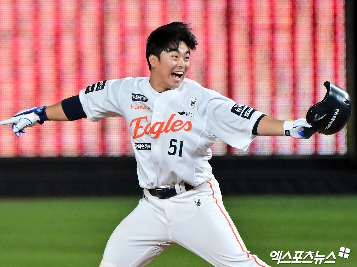 (엑스포츠뉴스 대전, 조은혜 기자) 한화 이글스의 '돌멩이' 문현빈이 무려 10구의 승부 끝에 끝내기 안타를 터뜨리며 6연승과 함께 멋진 전반기 피날레를 팀에 안겼다. 문현빈 덕분에 한화 팬들은 행복하게 올스타 휴식기를 맞게 됐다.