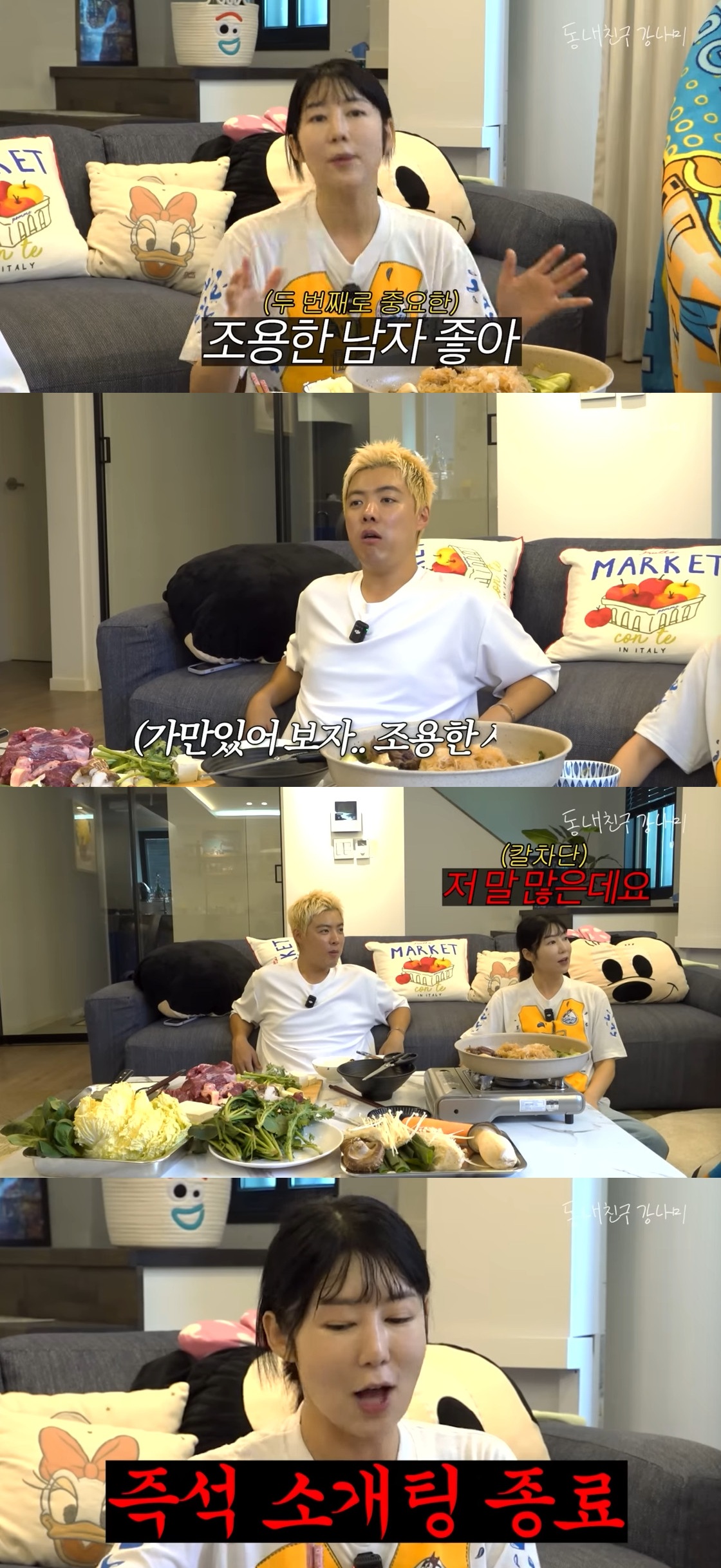 또한 사유리는 "조용한 남자가 좋다"고 덧붙였고, 강남은 말이 없는 남성을 생각하다가 촬영 중인 제작진 한 명을 지목해 "저분 말 없다"고 이야기했다. 이에 제작진은 "나 말 많다"고 단호하게 답했고, 사유리는 "나 까인 거냐. 나도 싫다"고 발끈해 또 한 번 웃음을 자아냈다.