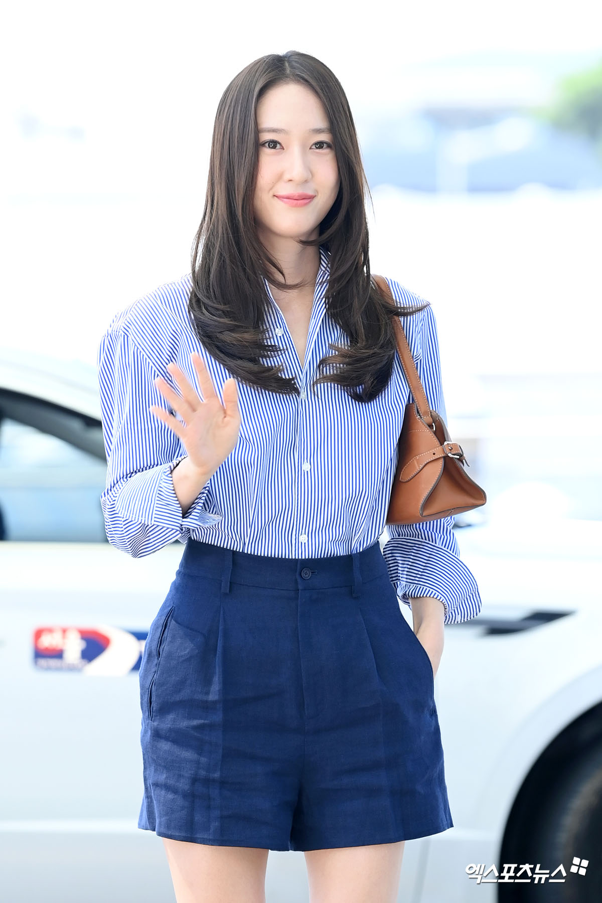 이날 정수정은 블루 스트라이프 셔츠에 하이웨이스트 네이비 쇼츠를 매치해 깔끔하면서도 단정한 공항 패션을 완성했다. 여기에 브라운 컬러의 미니 숄더백과 화이트 스트랩 샌들 힐을 매치해 세련된 포인트를 더했다.