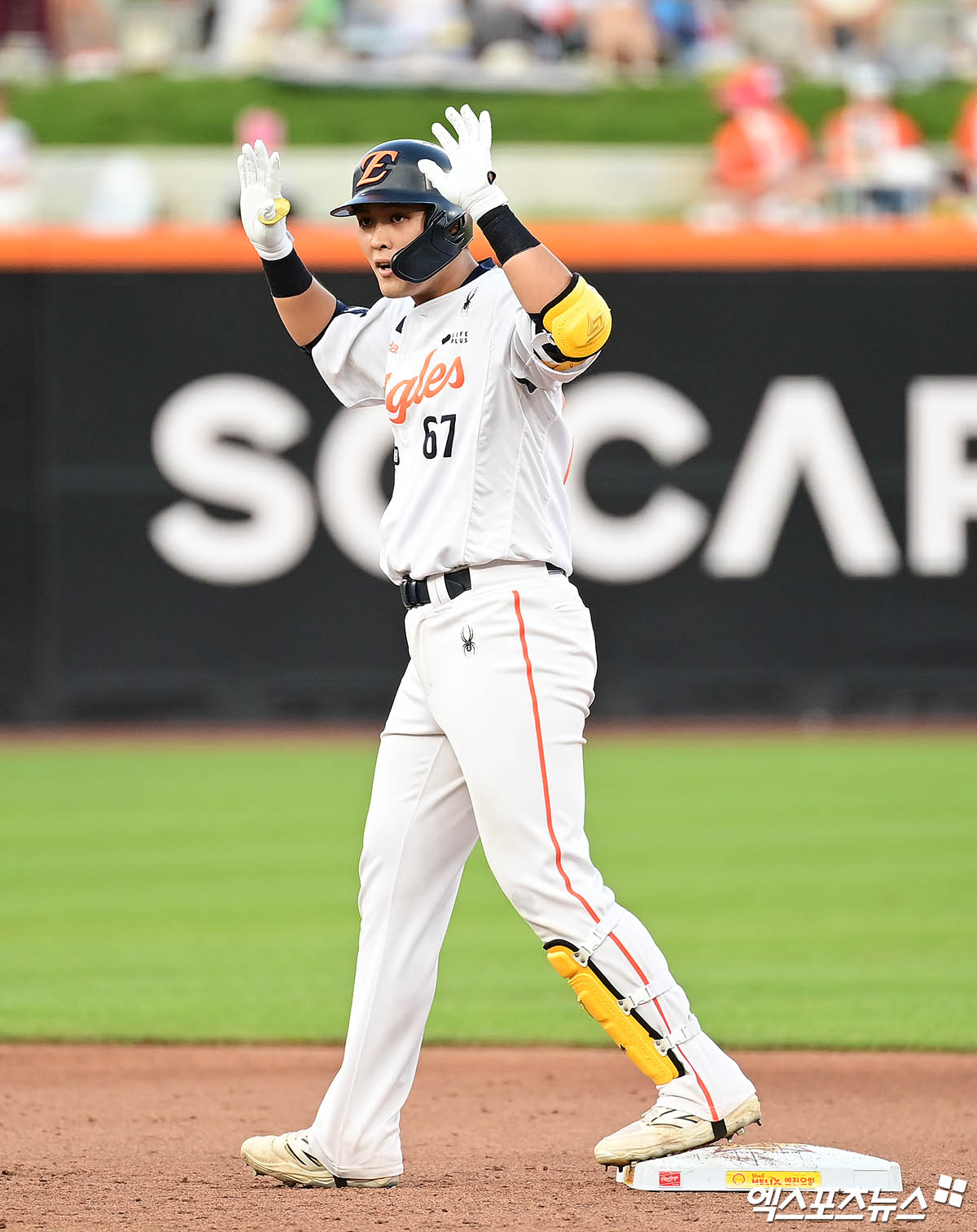 (엑스포츠뉴스 대전, 박지영 기자) 11일 오후 대전한화생명볼파크에서 열린 '2025 신한 SOL Bank KBO 퓨처스 올스타전' 남부리그와 북부리그의 경기, 3회말 2사 1,2루 북부 한지윤이 2타점 적시 2루타를 때려내고 있다.