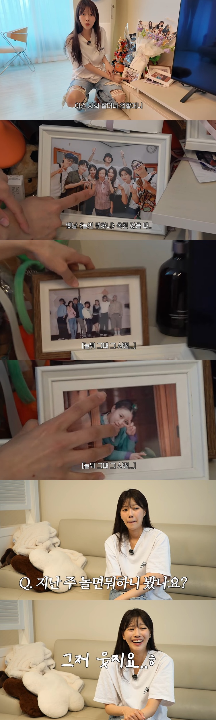 거실에는 많은 액자가 놓여 있었고, 그중 '놀면 뭐하니' 멤버들과 이미주의 외할머니가 함께한 사진이 담겨 있었다.