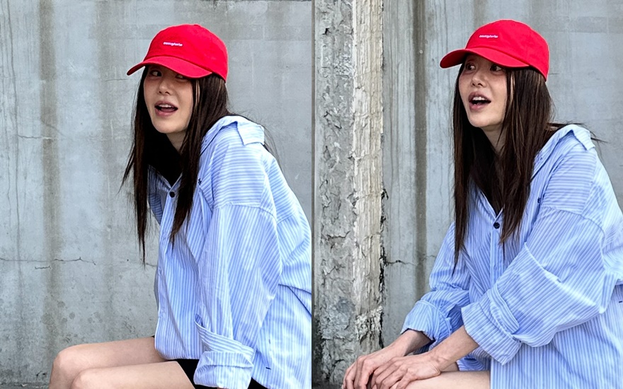 공개된 사진 속 고현정은 하늘색 스트라이프 오버핏 셔츠에 검은색 숏팬츠, 검은색 샌들에 빨간색 캡모자로 포인트를 준 채 포즈를 취하는 모습이다.
