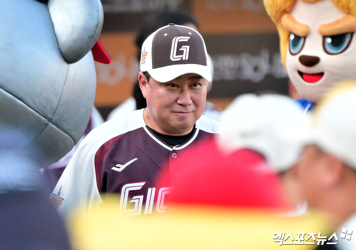 (엑스포츠뉴스 대전, 김한준 기자) 12일 오후 대전한화생명볼파크에서 열린 '2025 신한 SOL Bank KBO 올스타전' 드림 올스타와 나눔 올스타의 경기, 드림 올스타 김태형 감독이 입장하고 있다.