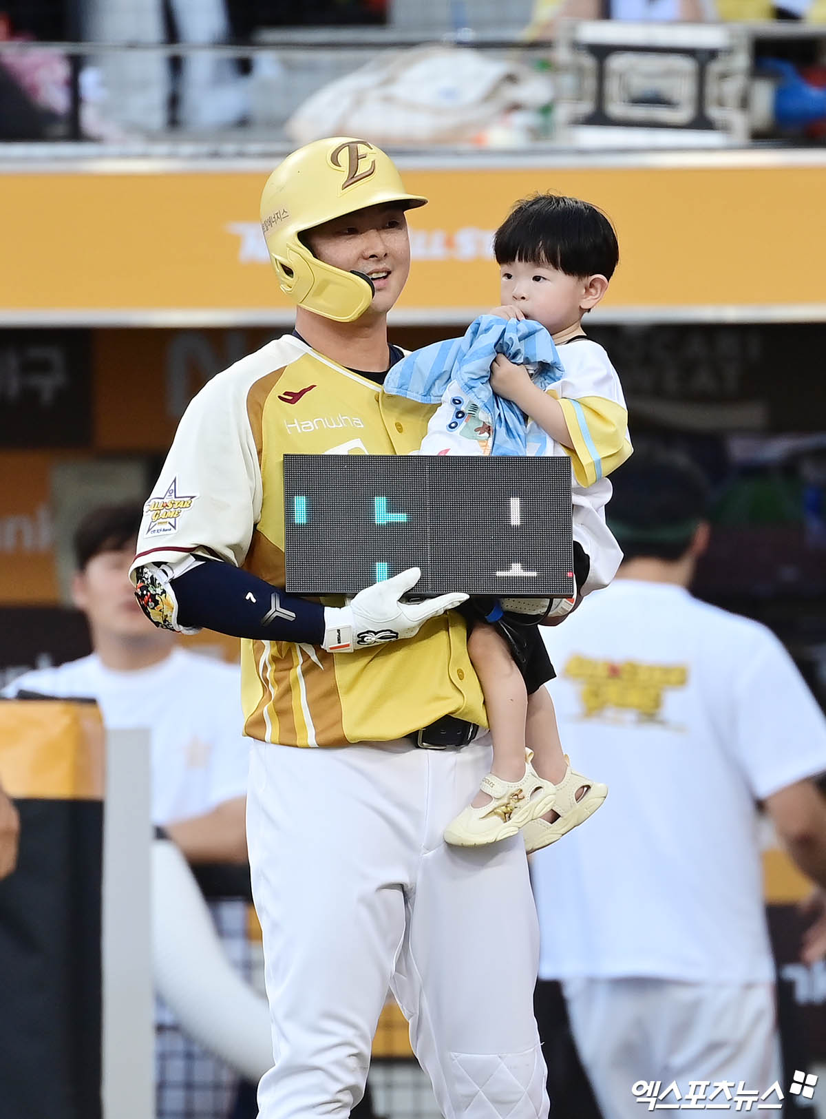 (엑스포츠뉴스 대전, 박지영 기자) 12일 오후 대전 한화생명볼파크에서 열린 '2025 신한 SOL Bank KBO 올스타전' 드림 올스타와 나눔 올스타의 경기, 2회말 1사 3루 나눔 이도윤이 아들과 함께 타석에 나서고 있다.