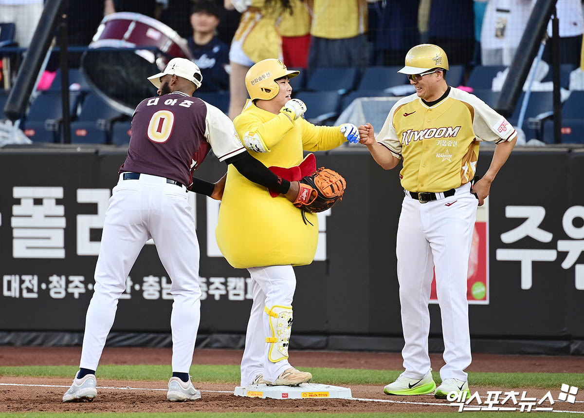 (엑스포츠뉴스 대전, 박지영 기자) 12일 오후 대전 한화생명볼파크에서 열린 '2025 신한 SOL Bank KBO 올스타전' 드림 올스타와 나눔 올스타의 경기, 나눔 문현빈이 꿈돌이 퍼포먼스와 함께 안타를 때려내고 있다.