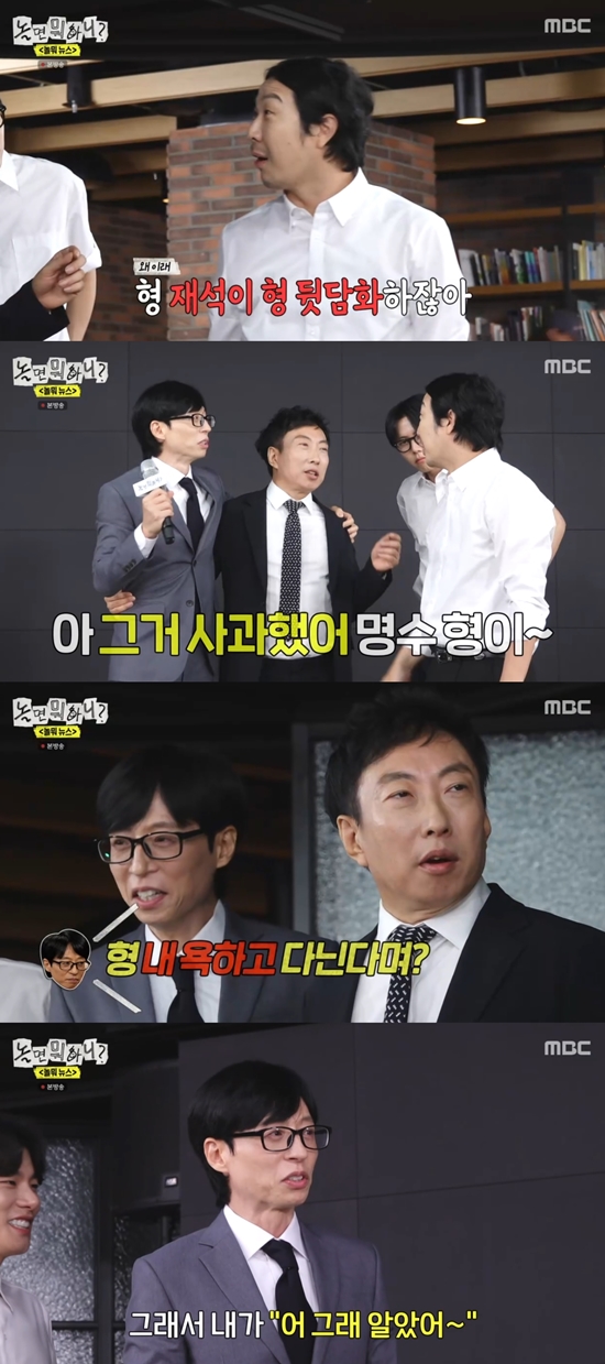 박명수는 "재석이한테 '형 내 욕하고 다닌다며, 하하랑 지석진 형이 그러더라'라며 전화가 왔다. 맞다고 대답하고 '미안하다' 그랬다. 증인이 있는데 어떡하냐"라며 뒷담화 사건의 경위를 설명했다. 이에 유재석은 "형이 시인을 했다. 그래서 내가 '알았다. 형이 솔직하게 얘기해줬으니까 나도 용서할게'라고 했다. (서로) 전화가 (연결) 됐고 내가 형한테 고기를 보냈다"라며 화해 과정을 공개했다.