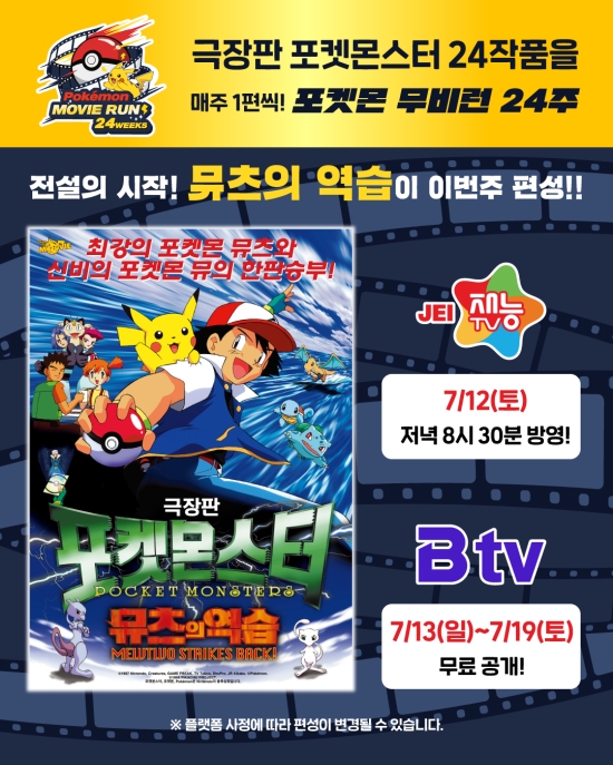 11일 ㈜포켓몬코리아는 재능TV·SK브로드밴드와 함께 TV·VOD 플랫폼에서 특별 편성 프로모션 '포켓몬 무비런 24주'를 진행한다고 밝혔다.