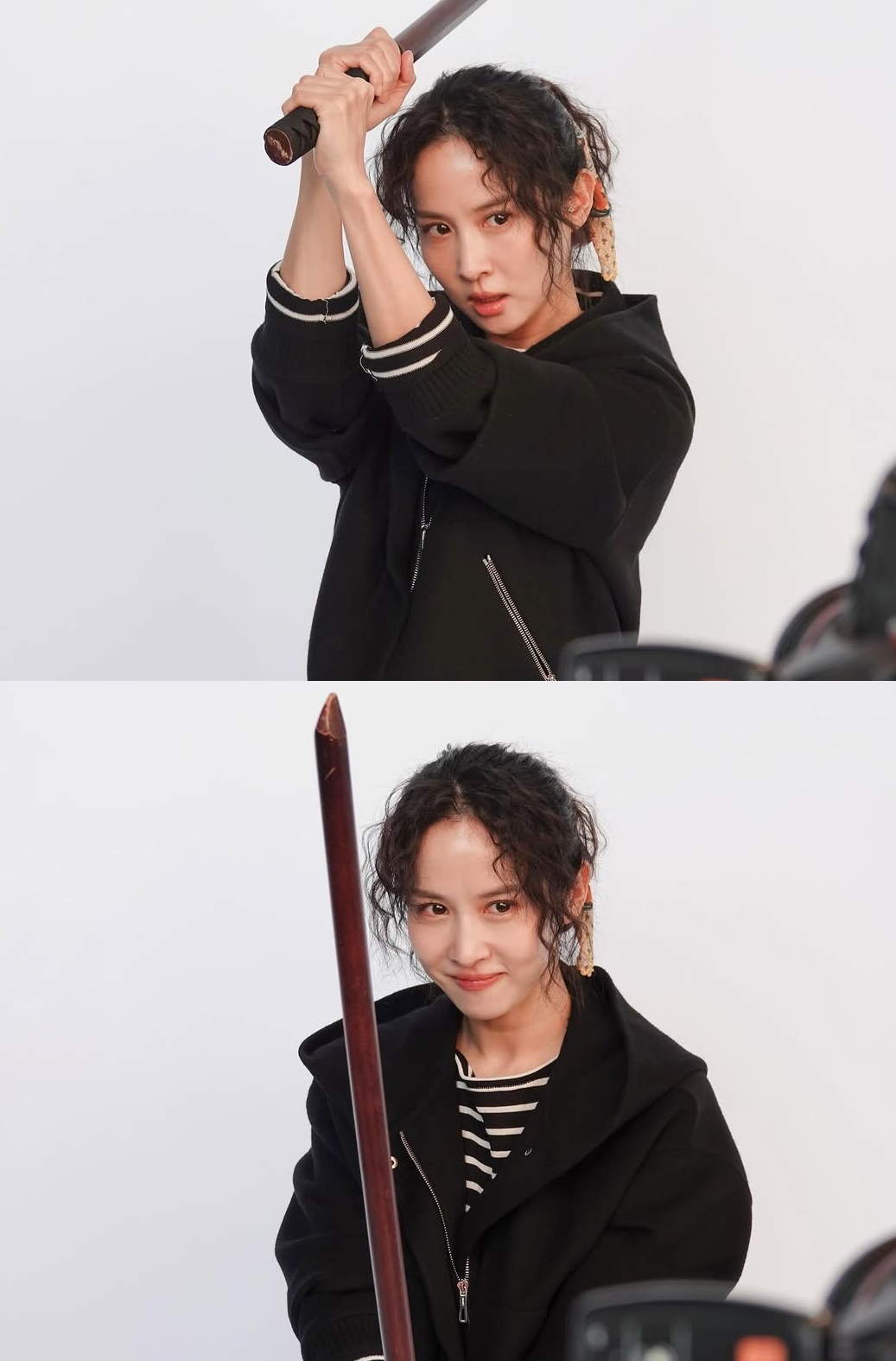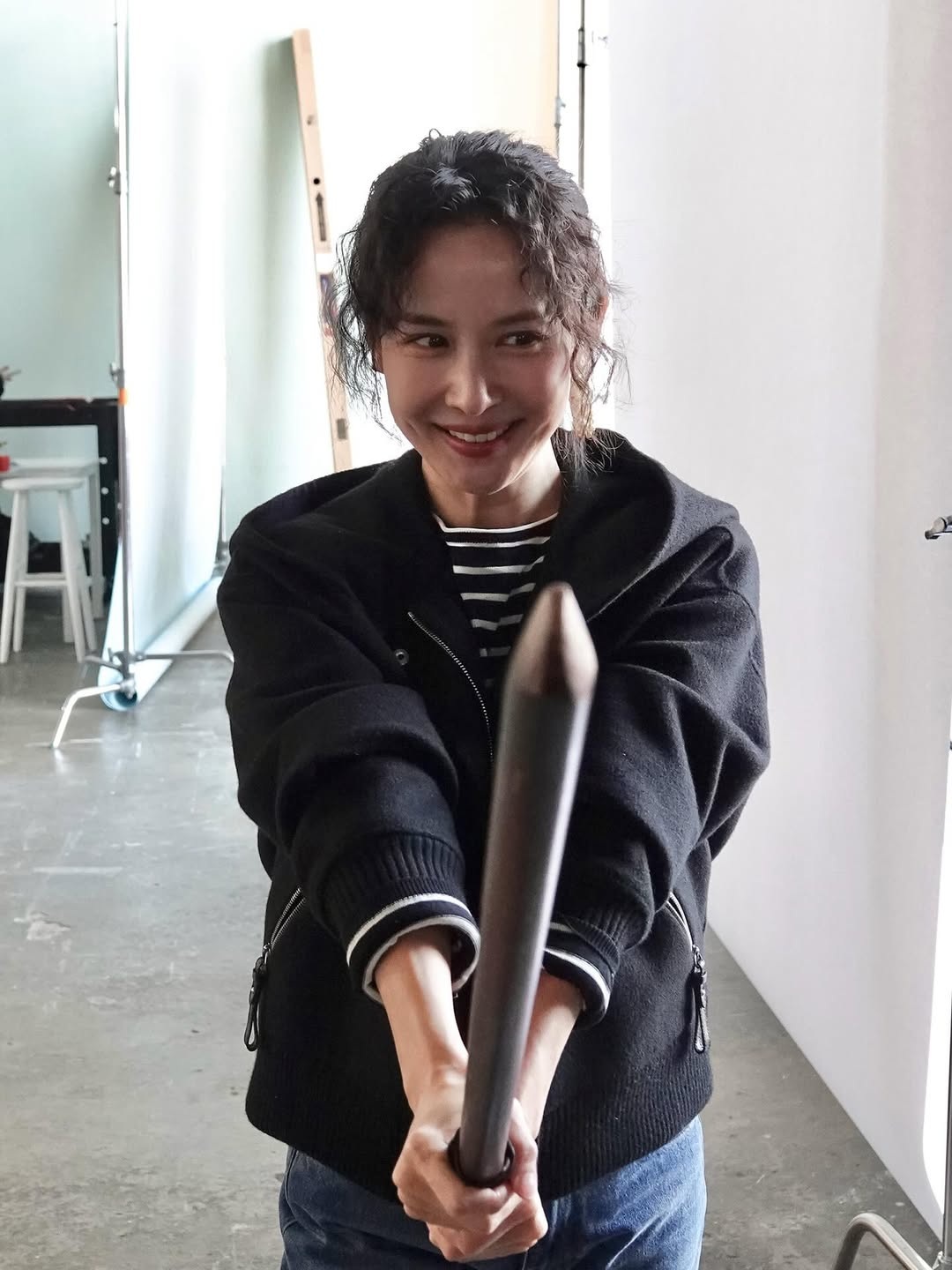 공개된 사진 속 조여정은 블랙 재킷과 스트라이프 티셔츠를 매치한 채, 양손으로 기다란 막대를 움켜쥔 포즈를 취하고 있다. 장난기 가득한 눈웃음과는 달리 정면을 겨누는 묘한 긴장감이 인상적이다.