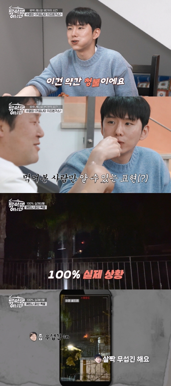 촬영을 마치고 제작진과 '류학식'을 나눠 먹고 있던 그 순간, 바깥에서 에트나 화산이 터져 용암이 분출됐다. 불과 8시간 전 등반했던 화산이 폭발했다는 소식에 숙소의 모든 인원이 밖으로 나와 용암 분출을 지켜봤다.
