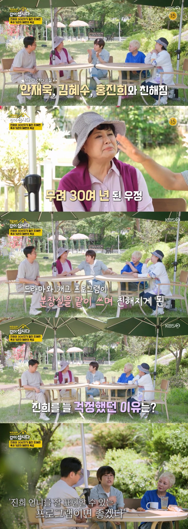 홍진희와 함께 등장한 조혜련에 박원숙이 "둘이 친하냐"고 묻자, 조혜련은 "안재욱, 김혜수, 홍진희가 '짝'할 때 만났다"며 30년째 이어져 오고 있는 우정을 언급했다.