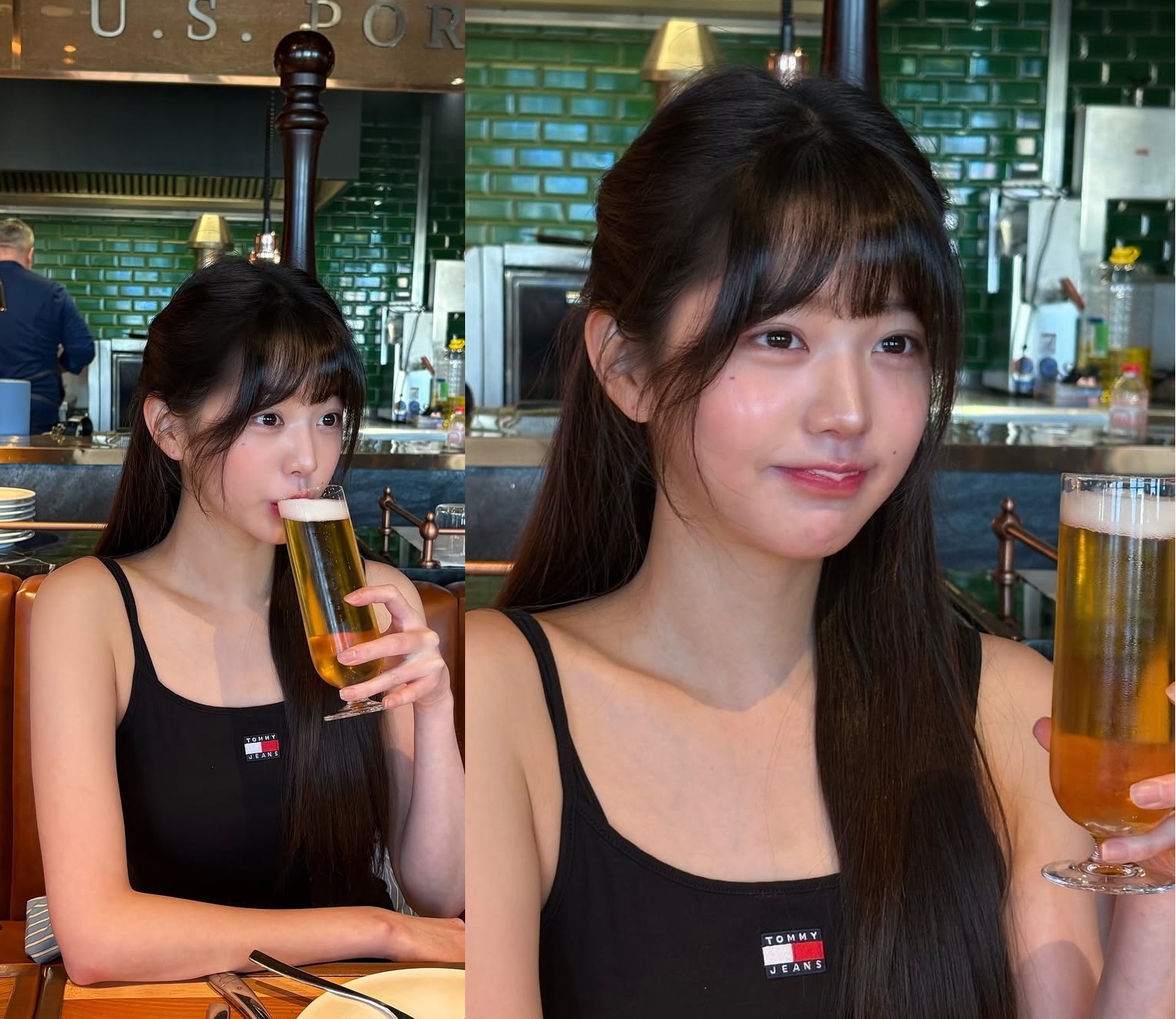 맥주잔을 들고 눈을 감은 채 미소 짓는 모습은 광고를 연상케 해 팬들의 마음을 울린 장원영은 긴 생머리와 뱅 앞머리로 귀여운 매력을 더했다.