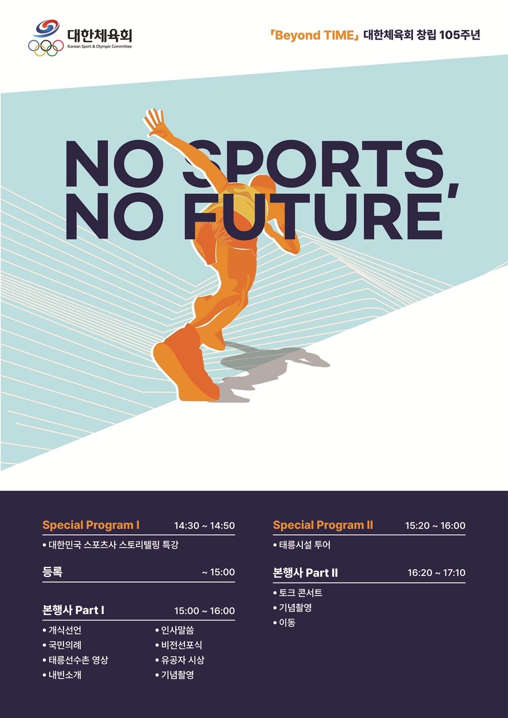 (엑스포츠뉴스 최원영 기자) 대한체육회가 창립 105주년을 맞아 15일 오후 3시 태릉선수촌에서 '<Beyond TIME> 대한체육회 창립 105주년 No Sports, No Future' 행사를 개최한다.