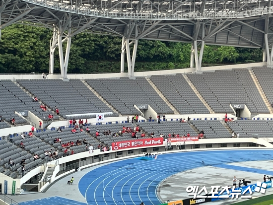 (엑스포츠뉴스 용인, 김정현 기자) 대한민국 축구 대표팀을 응원하는 서포터즈 '붉은악마'의 숫자가 바다 건너 일본에서 온 '울트라 닛폰'보다 매우 적어 응원전에서 먼저 지고 들어간다.