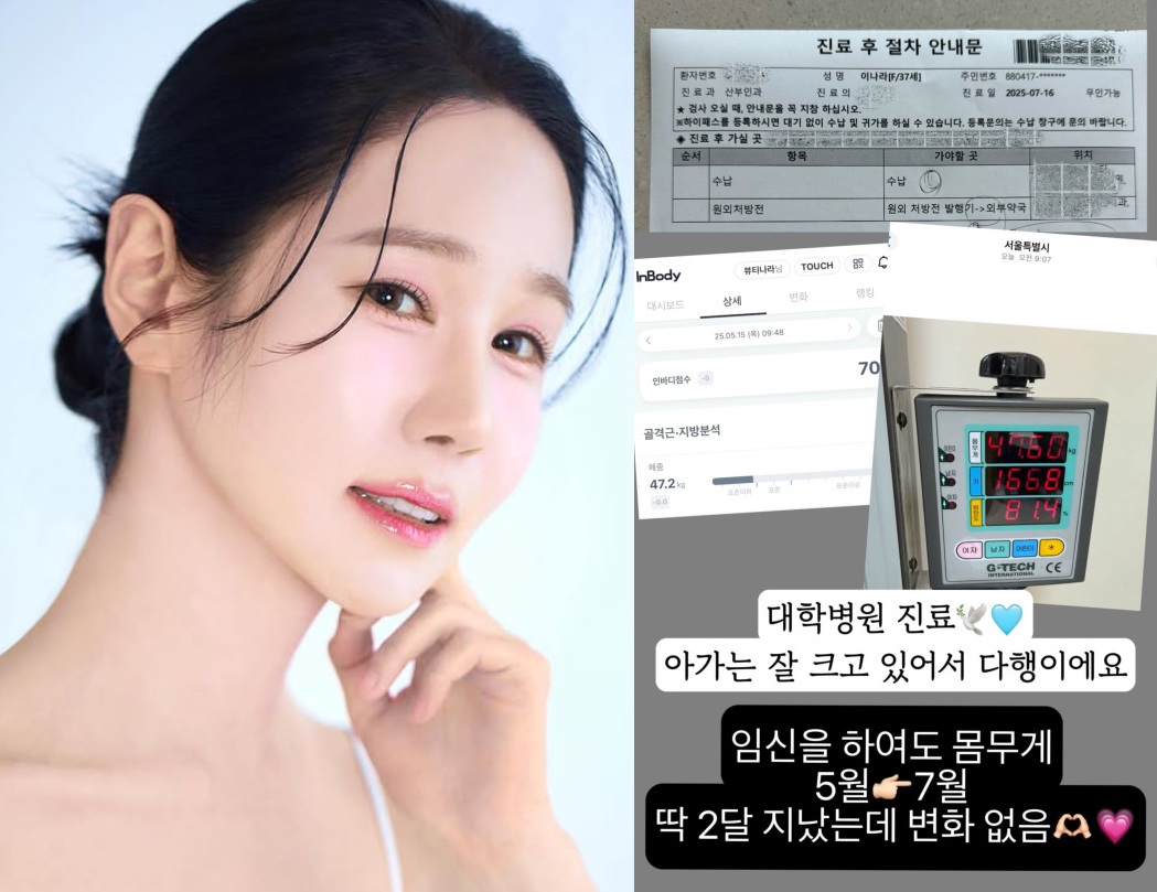 그는 "대학병원 진료. 아가는 잘 크고 있어서 다행이다"라는 글과 함께 자신의 몸무게를 공개했다.