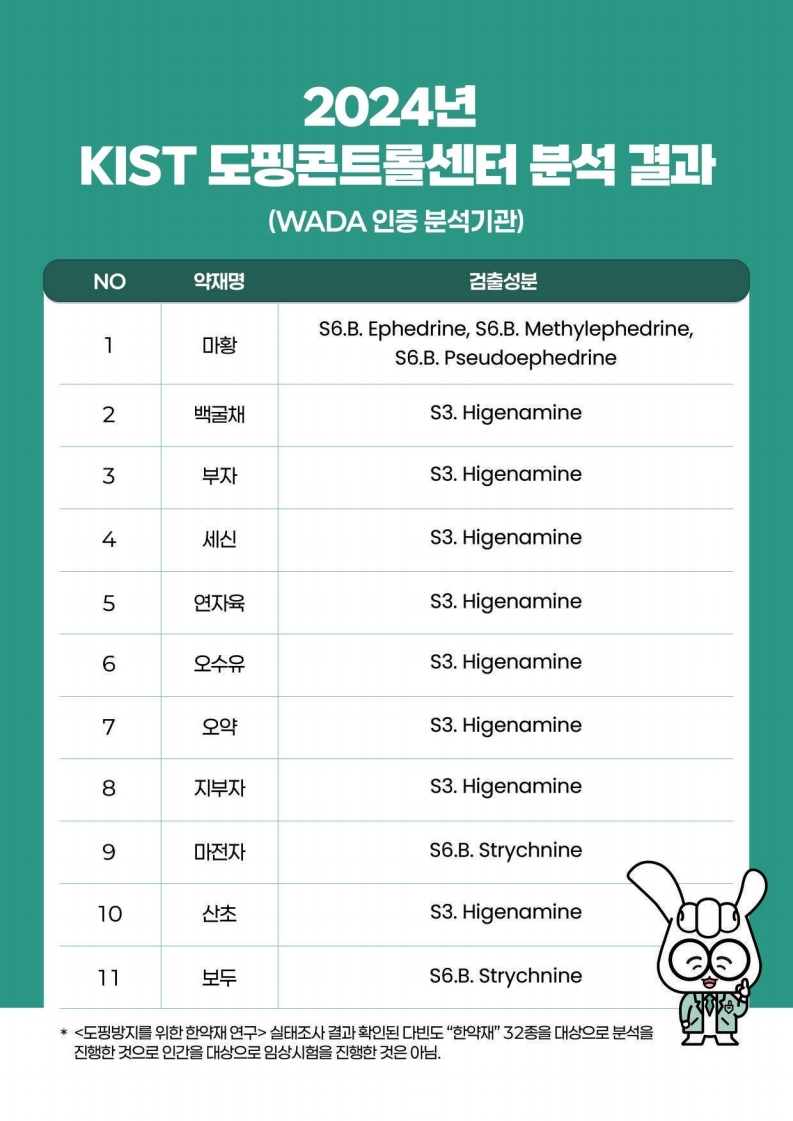 이번 가이드라인은 2024년 KADA가 주관하고, 한국과학기술연구원(이하 KIST) 도핑콘트롤센터 및 한국체육대학교 스포츠분석센터 연구팀이 공동 수행한 '도핑방지를 위한 한약재 연구'의 주요 결과를 요약해 제작됐다.